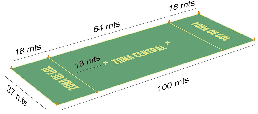 El terreno de juego: Es de forma rectangular (64 metros de largo), con una zona de marca en cada lado (18 metros cada una). Es decir, 100 metros en total.
